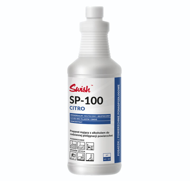 Swish SP-100 CITRO płyn do mycia z alkoholem to preparat czyszczący o nowoczesnej formule, który zawiera alkohol i doskonale nadaje się do mycia wszelkich powierzchni odpornych na działanie wody. Idealnie sprawdza się m.in. w czyszczeniu posadzek oraz innych powierzchni, które wymagają skutecznego usuwania zabrudzeń. Po przez dodatek alkoholu ma właściwości antypoślizgowe, antyseptyczne i antystatyczne.